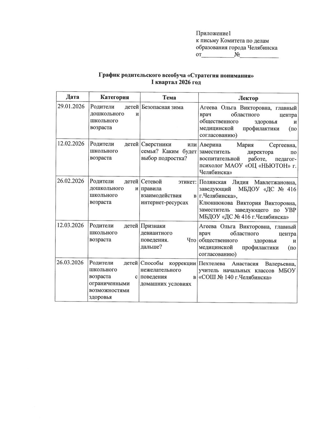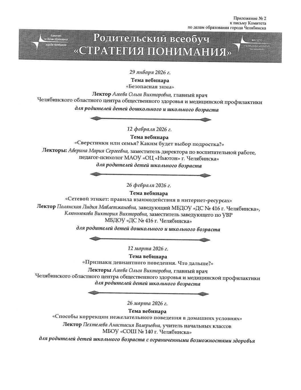 С целью оказания помощи родителям в 2025/2026 учебном году продолжает свою работу образовательный проект МАУ ДПО "Челябинский институт Просвещения" - родительский всеобуч "Стратегия понимания". Предлагаем ознакомиться с графиком родительского всеобуча на I квартал 2026 года.
